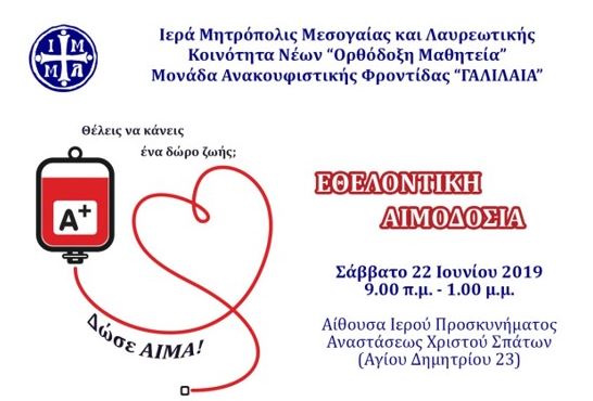 Το Σάββατο 22 Ιουνίου 2019 στις 9:00 π.μ – 13:00 θα διεξαχθεί αιμοδοσία από τη Μονάδα Ανακουφιστικής Φροντίδας «ΓΑΛΙΛΑΙΑ» στην αίθουσα του ιερού προσκυνήματος Αναστάσεως Χριστού Σπάτων. (Αγίου Δημητρίου 23)