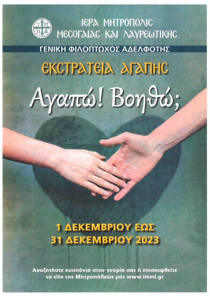 Εκστρατεία αγάπης με τίτλο “Αγαπώ! Βοηθώ;” διοργανώνει η Γενική Φιλόπτωχος Αδελφότητα της Ιεράς Μητρόπολης Μεσογαίας και Λαυρωτικής από την 1η Δεκεμβρίου έως τις 31 Δεκεμβρίου 2023.