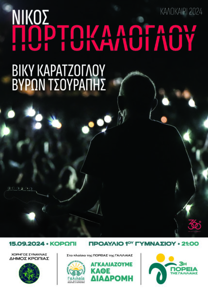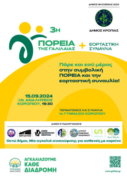 Θα ακολουθήσει σύντομη συμβολική πεζοπορία από τον Ιερό Ναό Αναλήψεως του Κυρίου προς το 1ο Γυμνάσιο Κορωπίου και η τελετή έναρξης της 3ης «ΠΟΡΕΙΑΣ ΤΗΣ ΓΑΛΙΛΑΙΑΣ» θα κλείσει πανηγυρικά με συναυλία του Νίκου Πορτοκάλογλου. Ασθενείς, εθελοντές, εργαζόμενοι, φίλοι και φίλες της «ΓΑΛΙΛΑΙΑΣ» θα είναι όλοι εκεί!