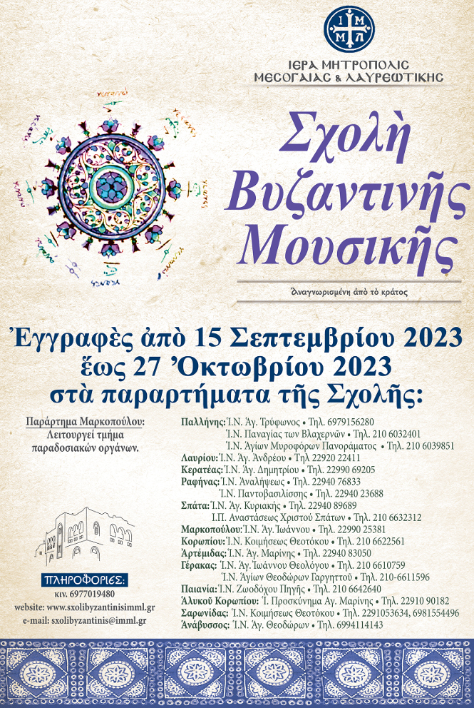 Ξεκίνησαν οι εγγραφές στα παραρτήματα της Σχολής Βυζαντινής Μουσικής της Ιεράς Μητρόπολης Μεσογαίας και Λαυρεωτικής. Οι εγγραφές ολοκληρώνονται στις 27 Οκτωβρίου.
