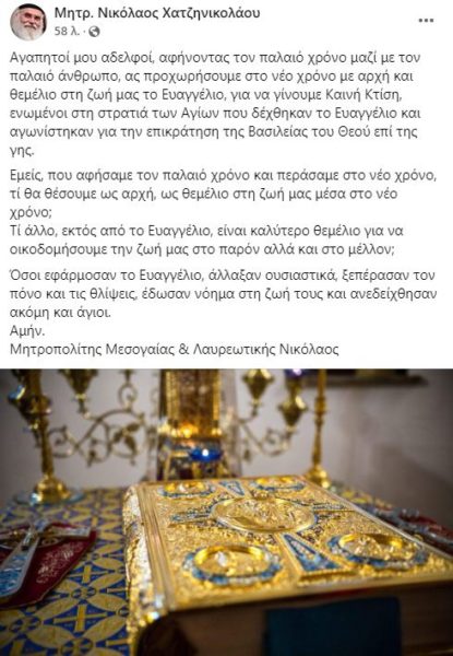 Ας προχωρήσουμε στο νέο χρόνο με αρχή και θεμέλιο στη ζωή μας το Ευαγγέλιο προτρέπει ο Σεβασμιώτατος Μητροπολίτης Μεσογαίας και Λαυρεωτικής κ. Νικόλαος.