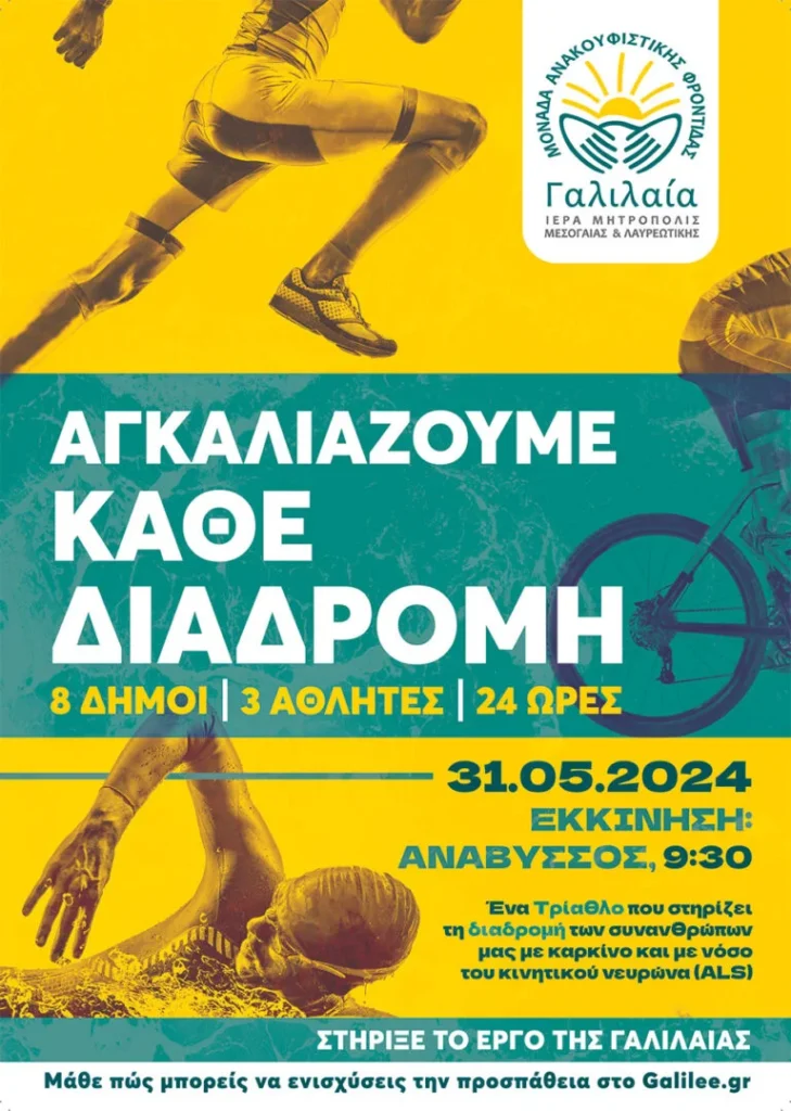 Η δράση αυτή περιλαμβάνει ένα ΤΡΙ-Αθλο που θα πραγματοποιήσουν 3 νέα παιδιά με εκκίνηση και τερματισμό στην Ανάβυσσο. Ο Σωτήρης, ο Παναγιώτης και η μικρή Λουκία θα προσπαθήσουν συμβολικά να «αγκαλιάσουν» τη διαδρομή σε έναν δύσκολο αγώνα ζωής, ασθενών και φροντιστών, με έναν απαιτητικό ΤΡΙ-Αθλο διάρκειας περίπου 24 ωρών (Κολύμπι – Ποδήλατο – Τρέξιμο) σε μια διαδρομή 150 χιλιομέτρων που καλύπτει και τους 8 Δήμους της Ιεράς Μητροπόλεως Μεσογαίας & Λαυρεωτικής (Σαρωνικού, Κρωπίας, Παιανίας, Παλλήνης, Σπάτων-Αρτέμιδος, Ραφήνας- Πικερμίου, Μαρκόπουλου και Λαυρεωτικής).