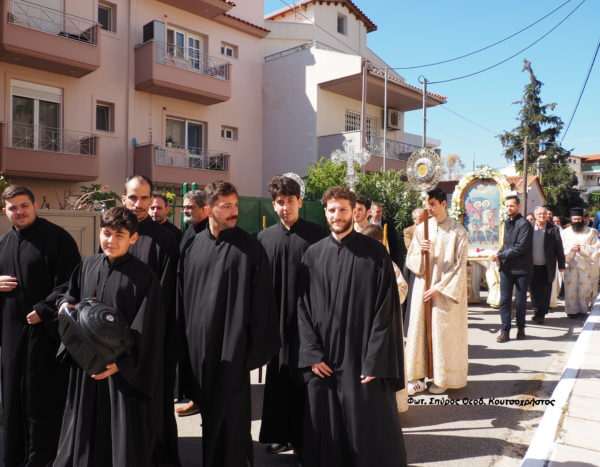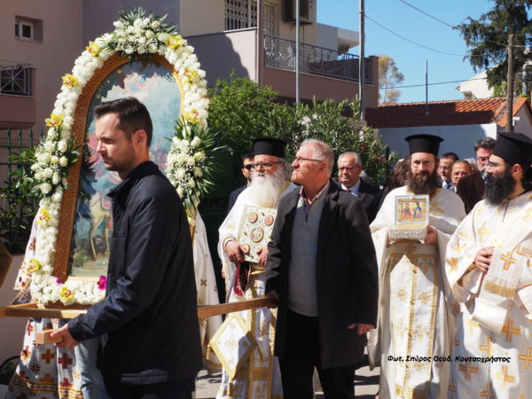 Πριν την “Απόλυση ” της Θείας Λειτουργίας, έγινε περιφορά της Ιεράς εικόνας, των Αγίων Θεοδώρων, πέριξ του Ιερού Ναού.