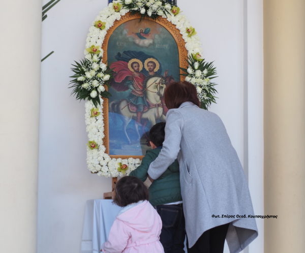 Πριν την “Απόλυση ” της Θείας Λειτουργίας, έγινε περιφορά της Ιεράς εικόνας, των Αγίων Θεοδώρων, πέριξ του Ιερού Ναού.