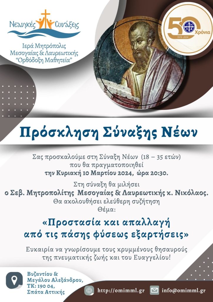 Η Ιερά Μητρόπολη Μεσογαίας και Λαυρεωτικής προσκαλεί στη Σύναξη Νέων (18- 35 ετών) που θα πραγματοποιηθεί την Κυριακή 10 Μαρτίου στις 20:30. Στη σύναξη θα μιλήσει ο Σεβασμιώτατος Μητροπολίτης Μεσογαίας και Λαυρεωτικής κ. Νικόλαος.