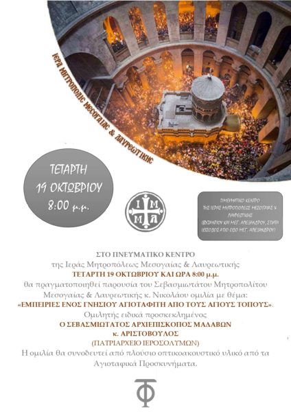 17/10/2022 17/10/2022 Η κοινότητα νέων «Ορθόδοξη μαθητεία» διοργανώνει εκδήλωση με κεντρικό θέμα: «Εμπειρίες ενός γνήσιου Αγιοταφίτη από τους Αγίους Τόπους», το οποίο θα αναπτύξει ο Σεβασμιώτατος Μητροπολίτης Μαδάβων κ. Αριστόβουλος (Πατριαρχείο Ιεροσολύμων). Η εκδήλωση θα πραγματοποιηθεί παρουσία του Μητροπολίτη Μεσογαίας και Λαυρεωτικής κ. Νικολάου στο Πνευματικό Κέντρο της Μητροπόλεως (Βυζαντίου και Μεγ. Αλεξάνδρου, Σπάτα Αττικής – είσοδος...