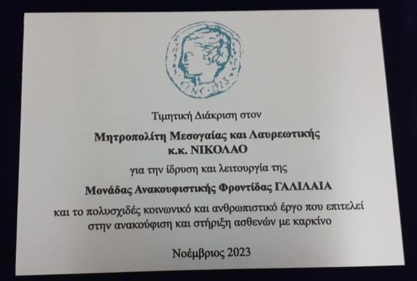 Για τη «ΓΑΛΙΛΑΙΑ» ήταν μέρα τιμής και χαράς. Την τιμητική διάκριση ευγνωμοσύνης για την ίδρυση και λειτουργία της Μονάδας Ανακουφιστικής Φροντίδας, αλλά και για το πολυσχιδές κοινωνικό και ανθρωπιστικό έργο που επιτελείται στην ανακούφιση και στήριξη ασθενών με καρκίνο, παρέλαβε ο Σεβασμιώτατος Μητροπολίτης Μεσογαίας και Λαυρεωτικής κ. Νικόλαος, πρόεδρος της ΜΑΦ ΓΑΛΙΛΑΙΑ.