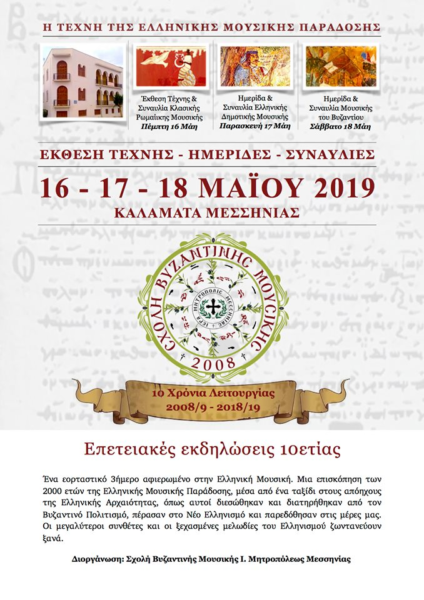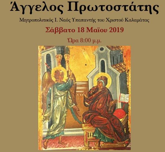 Γιορτάζοντας τα δέκα χρόνια λειτουργίας της η Σχολή Βυζαντινής Μουσικής της Ιεράς Μητροπόλεως Μεσσηνίας, το ψαλτικό σύνολο Ρωμαίικο και η χορωδία της σχολής Χόρευμα παρουσιάζουν το “Άγγελος Πρωτοστάτης ήχος πλ. Δ’. Τότε και Σήμερα”. Η μουσική εκδήλωση θα πραγματοποιηθεί το Σάββατο 18 Μαΐου στις 8 μ.μ. Θα διευθύνουν ο Δρ. Γιώργος Μπιλάλης και ο Κωνσταντίνος Σιάχος.