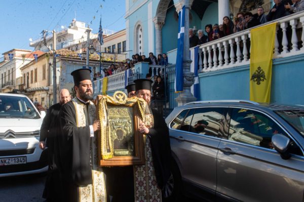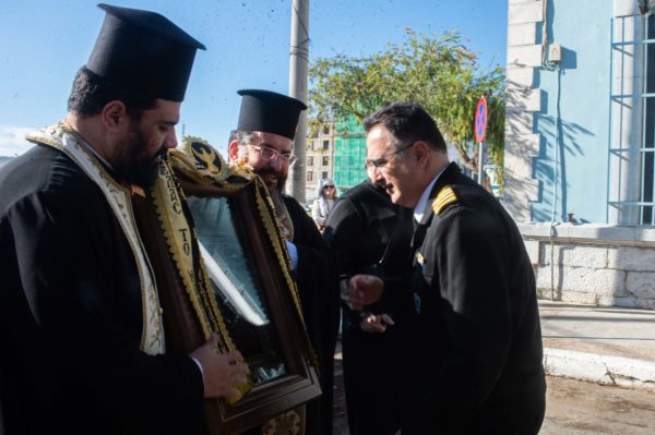 Εν συνεχεία η Ιερά Εικόνα αναχώρησε από τον Ιερό Ναό και ως ένδειξη τιμής στον αγώνα που καταβάλλεται από το Λιμενικό Σώμα της πατρίδας μας για την προάσπιση των θαλάσσιων συνόρων μας, πραγματοποιήθηκε ολιγόλεπτη στάση στο Λιμεναρχείο Καλαμάτας και αναπέμφθηκε δέηση.