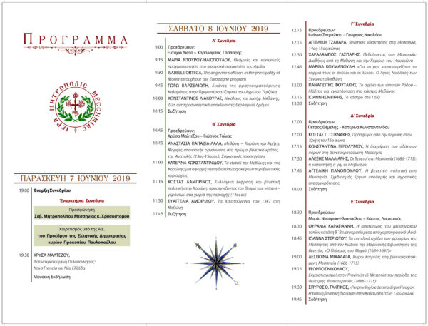 Η Ιερά Μητρόπολις Μεσσηνίας σε συνεργασία με την Ακαδημία Αθηνών, το Εθνικό και Καποδιστριακό Πανεπιστήμιο Αθηνών και το Εθνικό Ίδρυμα Ερευνών διοργανώνει Διεθνές Επιστημονικό Συνέδριο, υπό την αιγίδα της Α.Ε. του Προέδρου της Ελληνικής Δημοκρατίας κ. Προκοπίου Παυλόπουλου στην Καλαμάτα από την Παρασκευή 7 Ιουνίου έως και την Κυριακή 9 Ιουνίου 2019 με θέμα: «Φράγκοι και Βενετοί στη Μεσσηνία-Διερευνώντας το δυτικό παρελθόν της Πελοποννήσου».