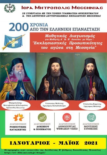 Περατώθηκε την 21η Μαΐου 2021 ο Παμμεσσηνιακός Διαγωνισμός Δοκιμίου, Ποιήματος και Έργων ψηφιακής δημιουργίας (βίντεο, ρομποτική κατασκευή με κίνηση, μουσική δημιουργία με ψηφιακά μέσα), για μαθητές και μαθήτριες Α΄ καί Β΄ Λυκείου με θέμα: «Εκκλησιαστικές Προσωπικότητες του αγώνα στήν Μεσσηνία: Μητροπολίτης Μονεμβασίας και Καλαμάτας Χρύσανθος Παγώνης, Επίσκοπος Κορώνης Γρηγόριος Μπίστης, Επίσκοπος Μεθώνης Γρηγόριος Παπαθεοδώρου», που διοργάνωσε η Ιερά Μητρόπολη Μεσσηνίας, σε συνεργασία με την Διεύθυνση Δευτεροβάθμιας Εκπαίδευσης Μεσσηνίας, στα πλαίσια των επετειακών εκδηλώσεων, με αφορμή τον εορτασμό της συμπλήρωσης διακοσίων ετών από την έναρξη της Ελληνικής Επανάστασης του 1821.