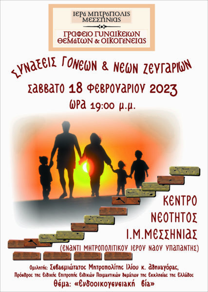 Η Ιερά Μητρόπολη Μεσσηνίας στην προσπάθειά της να στηρίξει το θεσμό της οικογένειας και να προετοιμάσει με το καλύτερο δυνατό τρόπο τα νέα ζευγάρια να «ζήσουν το γάμο τους» πραγματοποιεί και πάλι, μετά από την διετή διακοπή λόγω της πανδημίας, τις «Συνάξεις Γονέων και Νέων Ζευγαριών».
