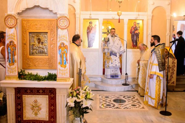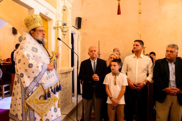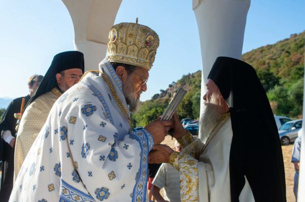 Εν συνεχεία προέστη της πανηγυρικής Θείας Λειτουργίας πλαισιωμένος από τον Καθηγούμενο της Μονής Αρχιμ. Προκόπιο Σμυρνή, τον εκ των αδελφών της Μονής Αρχιμ. Αλέξιο Σαραντόπουλο και τον Διάκονο Θεόφιλο Κυριάκο.