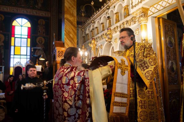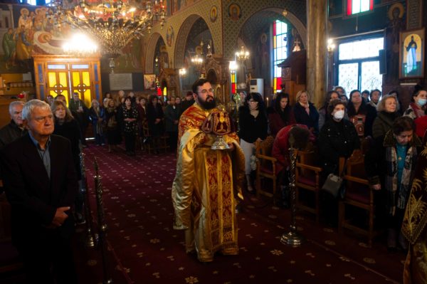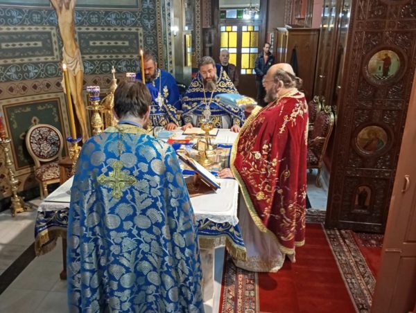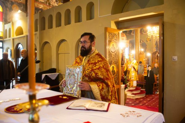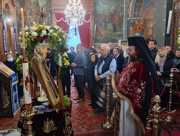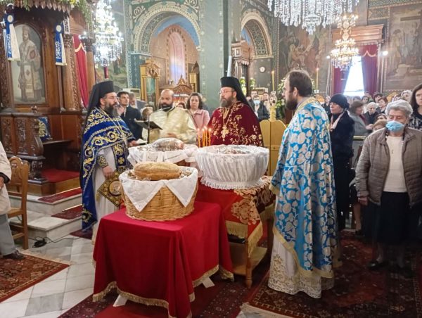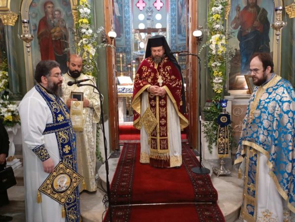 Τον Σεβασμιώτατο πλαισίωσαν οι εφημέριοι του ναού Αρχιμ. Αλέξιος Αρώνης και Πρωτοπρεσβύτερος Περικλής Τσίχλης και ο Διάκονος Θεόφιλος Κυριάκος.