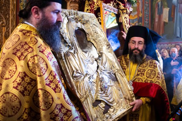 Εν συνεχεία εψάλη ο Μικρός Παρακλητικός Κανόνας της Θεοτόκου και κατά την ώρα που οι χοροί των ιεροψαλτών έψαλαν το Μεγαλυνάριον της Πολιούχου της Καλαμάτας “Δεύτε την εικόνα Υπαπαντής…” με ρίγη συγκινήσεως οι Σεβασμιώτατοι Μάνης και Μεσσηνίας μετέφεραν την Ιερά Εικόνα της Παναγίας από τον θρόνο της λιτάνευσης στον μόνιμο Θρόνο Της.