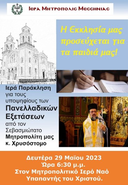 Την ερχόμενη Δευτέρα, 29 Μαΐου 2023, και ώρα 6:30 μ.μ., θα τελεσθεί στο Μητροπολιτικό Ιερό Ναό Υπαπαντής του Χριστού Καλαμάτας, Ιερά Παράκληση προς ενίσχυση και φωτισμό των υποψηφίων, οι οποίοι θα συμμετάσχουν στις πανελλήνιες εξετάσεις.