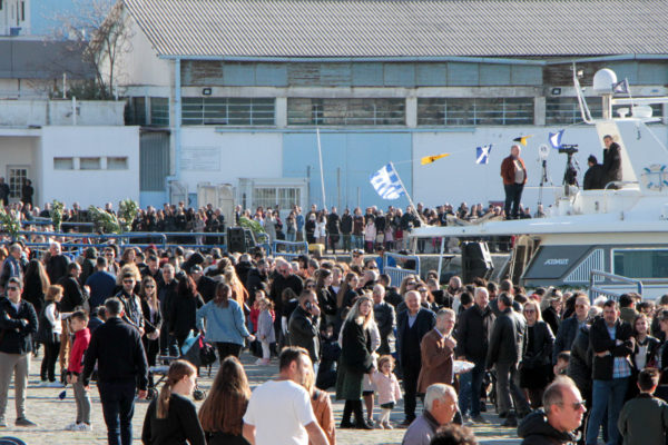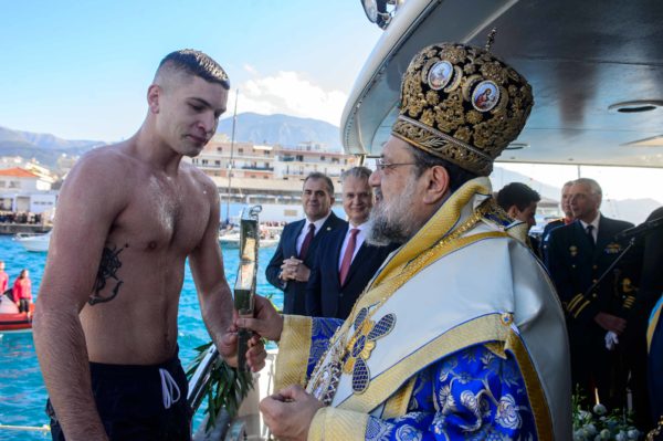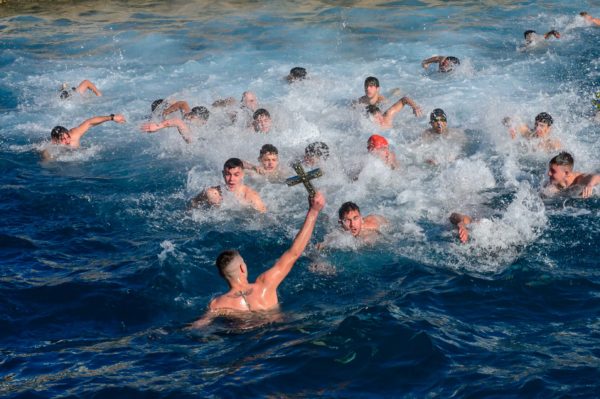 Πλειάδα κολυμβητών έπεσαν στη θάλασσα για να ανασύρουν τον Τίμιο Σταυρό. Τυχερός στάθηκε ο αθλητής Κωνσταντίνος Αδαμόπουλος.