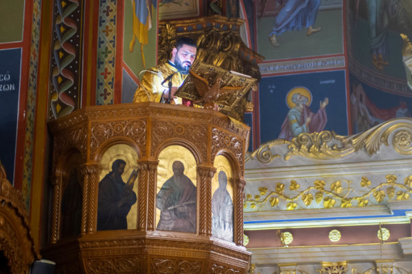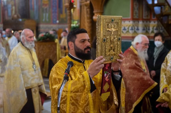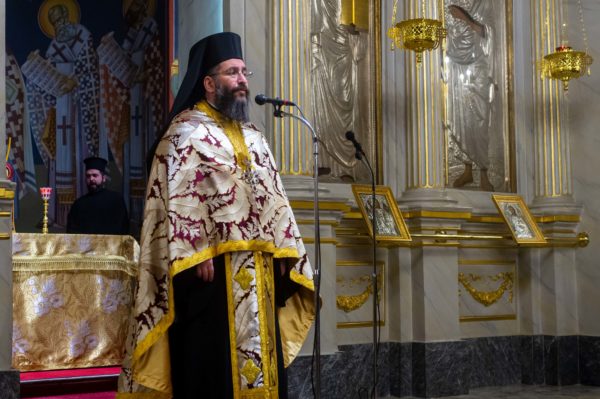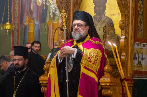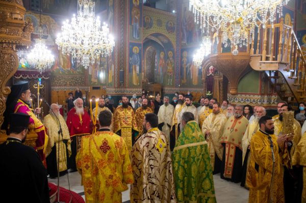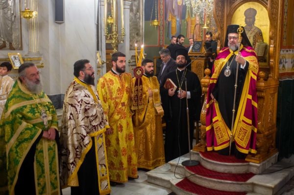 Τα αναλόγια πλαισίωσαν τα μέλη της χορωδίας της Σχολής Βυζαντινής Μουσικής της Ιεράς Μητροπόλεως, υπό την διεύθυνση του Πρωτοψάλτου και Διευθυντού της Σχολής κ. Κωνσταντίνου Σιάχου. Προ του πέρατος της Ακολουθίας ο Σεβασμιώτατος ευχήθηκε σε όλους Χρόνια Πολλά και να επικρατήσει η Ειρήνη και η ευημερία στην ανθρωπότητα.