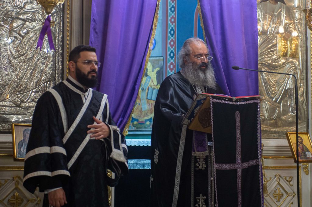 Τον Σεβασμιώτατο πλαισίωσαν ο εφημέριος του Ναού και Αρχιερατικός Επίτροπος Μεσσήνης Πρωτοπρεσβύτερος Κωνσταντίνος Μελισσουργός και ο Διάκονος Θεόφιλος Κυριάκος, ενώ το καθιερωμένο τροπάριο της Κασσιανής απέδωσαν μελωδικώτατα οι καλλιφωνώτατοι και μουσικολογιώτατοι κατά σάρκα υιοί του πατρός Κωνσταντίνου. Προ του πέρατος της Ακολουθίας ο Σεβασμιώτατος κηρύττοντας τον θείο λόγο αναφέρθηκε στα δύο πρόσωπα της σημερινής ημέρας, αυτό του Ιούδα και αυτό της πόρνης γυναικός, τονίζοντας τις μεταξύ τους διαφορές.
