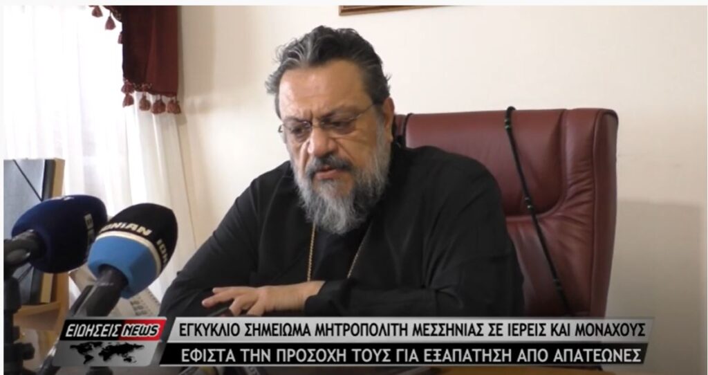 Με αφορμή την εγκύκλιο που εξέδωσε χθες και με την οποία εφιστά την προσοχή στους κληρικούς, ώστε να μην εξαπατηθούν εάν δεχθούν τηλεφώνημα στο οποίο τους ζητούν χρήματα για δήθεν οφειλόμενα στον ΕΦΚΑ από τους ναούς, ο Μητροπολίτης Μεσσηνίας, κ. Χρυσόστομος έδωσε συνέντευξη στο κανάλι Mεσόγειος TV, τονίζοντας τα εξής: «Θα πρέπει να είναι προσεκτικοί (σ.σ. οι Ιερείς). Να μην εμπιστεύονται ανθρώπους που δεν γνωρίζουν και για οποιεσδήποτε οχλήσεις που δέχονται πριν απ’ όλα να ενημερώνουν την Ιερά Μητρόπολη και να ρωτούν εάν πράγματι υπάρχει κάτι τέτοιο, καθώς επίσης και την αστυνομία. Τους είπαμε ότι δεν πρέπει να δίνουν τα προσωπικά τους στοιχεία και τους τραπεζικούς τους λογαριασμούς. Βρισκόμαστε σε μια επικίνδυνη κατάσταση. Όσο θα προχωράει η κρίση και θα αρχίζουν να εμφανίζονται προβλήματα στην οικονομία, θα εμφανίζονται πάρα πολλοί τέτοιου είδους απατεώνες, που θα προσπαθούν να εκμεταλλευτούν κυρίως ηλικιωμένους ανθρώπους, για να κερδίσουν χρήματα… Τους εφιστώ την προσοχή: να εμπιστεύονται τους οικείους τους και να μην δίνουν τα στοιχεία τους».