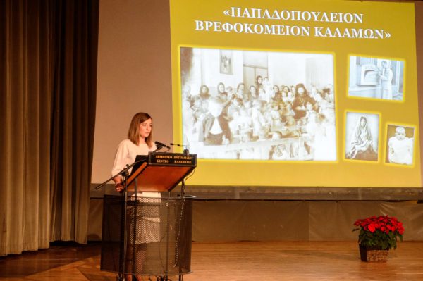 Η εκδήλωση ξεκίνησε με τον χαιρετισμό του Σεβασμιωτάτου Μητροπολίτη Μεσσηνίας κ. Χρυσοστόμου και ακολούθησε η ομιλία της κ. Αναστασίας Μηλίτση – Νίκα, Προϊσταμένης Γενικών Αρχείων του Κράτους στη Μεσσηνία, με θέμα: «Παπαδοπούλειον Βρεφοκομείον Καλαμών» Μια αναδρομή στο φιλανθρωπικό έργο του, 1901 έως σήμερα.