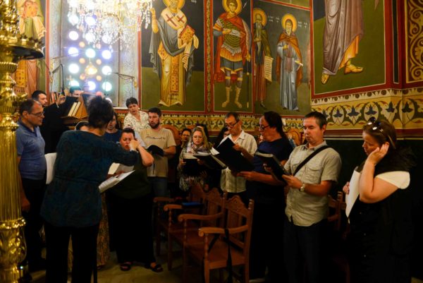Τους ύμνους απέδωσε η Χορωδία της Ιεράς Μητροπόλεως Στάρα Ζαγόρα, η οποία αυτές τις ημέρες συμμετείχε στο Διεθνές Φεστιβάλ Χορωδιών Καλαμάτας και την οποία διηύθυνε ο Σεβασμιώτατος Μητροπολίτης κ. Κυπριανός.