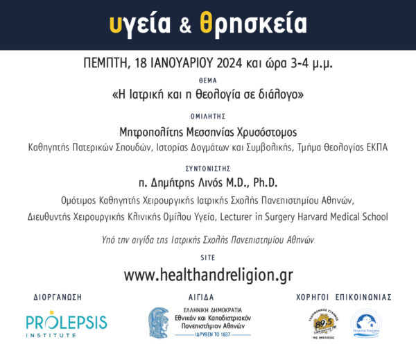 Την Πέμπτη 18 Ιανουαρίου 2024 και ώρα 15:00 – 16:00, θα πραγματοποιηθεί η τρίτη φετινή ομιλία του κύκλου διαδικτυακών μαθημάτων «Υγεία και Θρησκεία», τα οποία επιμελείται και συντονίζει ο Ομότιμος Καθηγητής της Χειρουργικής, π. Dimitrios Linos.