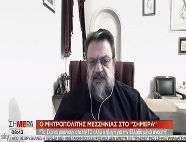 Καλεσμένος στην πρωινή εκπομπή του ΣΚΑΙ “ΣΗΜΕΡΑ” ήταν ο Σεβ. Μητροπολίτης Μεσσηνίας κ. Χρυσόστομος. Ο Σεβασμιώτατος αναφερόμενος στο θέμα της ένταξης των Σκοπίων στο ΝΑΤΟ ανέφερε: “Τα Σκόπια μπαίνουν στο ΝΑΤΟ αλλά η πληγή για την Ελλάδα μένει ανοικτή”. Επίσης αναφέρθηκε και στο ζήτημα της σχισματικής εκκλησίας των Σκοπίων λέγοντας χαρακτηριστικά: “η σχισματική εκκλησία στα Σκόπια πρόσφατα εξέλεξε επίσκοπο με τον τίτλο του Πολυανής. Η περιοχή αυτή βρίσκεται στο Κιλκίς και με πράξη του Οικουμενικού Πατριαρχείου ανήκει στις Μητροπόλεις των Νέων Χωρών”. Ερωτώμενος για την επίσκεψη του Πρωθυπουργού στη Θεολογική Σχολή της Χάλκης είπε “το μόνο θετικό από αυτή την επίσκεψη ήταν  ότι αναγνωρίστηκε η διεθνής θέση του Οικουμενικού Πατριαρχείου και πως το ζήτημα της επαναλειτουργίας της Θεολογικής Σχολής της Χάλκης δεν είναι ένα ζήτημα των διμερών σχέσεων Ελλάδος – Τουρκίας, αλλά ένα παγκόσμιο ζήτημα με διεθνές αντίκτυπο”.