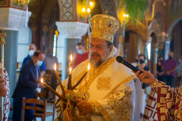 Ο Μητροπολίτης απευθυνόμενος στους πιστούς ανέφερε ότι η Υπεραγία Θεοτόκος αποτελεί σύμβολο αγάπης, προστασίας και ελπίδας για τον άνθρωπο και ευχήθηκε με τη συμβολή της να απαλλαγεί σύντομα η ανθρωπότητα από τις όποιες δοκιμασίες. Συνάμα ζήτησε πιστή τήρηση των υγειονομικών μέτρων κατά της πανδημίας, προέτρεψε σε εμβολιασμό και αποδοκίμασε τους συνομοσιολόγους και τους θρησκόληπτους που προσπαθούν να αποτρέψουν από τα παραπάνω και να διχάσουν το λαό.