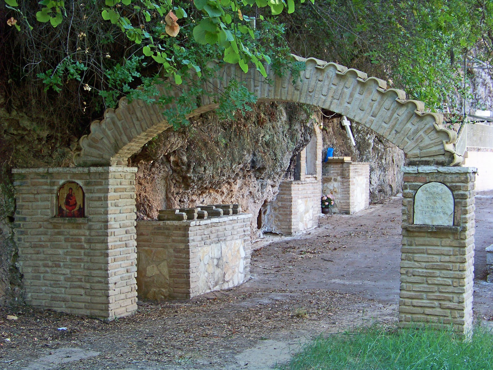 Λένε, πως η βραχώδης από πωρί όχθη του ποταμού, με περίεργα σχέδια και σταλακτίτες, σχηματίστηκε, χιλιάδες τώρα χρόνια, από τα άφθονα νερά της «Ξερόβρυσης». Στο βράχο αυτό έχει σχηματισθεί μια μικρή φυσική σπηλιά με σταλακτίτες που έχουν καταστραφεί κατά τη διαμόρφωσή της σε ναό.
