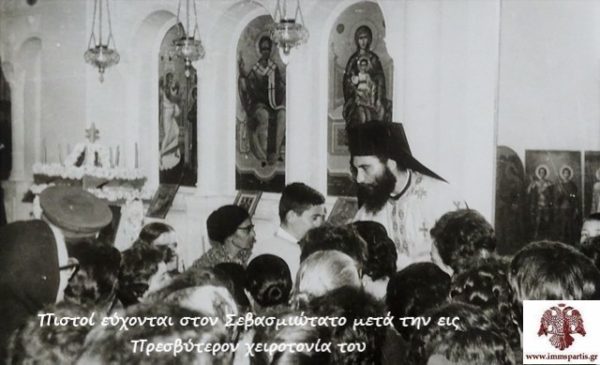 Στο ως άνω φωτογραφικό στιγμιότυπο, η μοναχική κουρά του Σεβασμιωτάτου στην Ιερά Μονή Βουλκάνου (1964). Παρακάτω, πιστοί εύχονται στον Σεβασμιώτατο μετά την εις Πρεσβύτερον χειροτονία του.