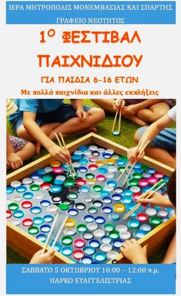 Το Γραφείο Νεότητας της Ιεράς Μητροπόλεως Μονεμβασίας και Σπάρτης οργανώνει το 1ο Φεστιβάλ Παιχνιδιού, που θα λάβει χώρα το Σάββατο 5 Οκτωβρίου 2024, από τις 10:00 το πρωί έως τις 12:00 το μεσημέρι, στο Πάρκο Ευαγγελιστρίας στη Σπάρτη. Το Φεστιβάλ αφορά παιδιά από 6 έτων, όπως και τους/τις εφήβους μας έως 16 ετών.