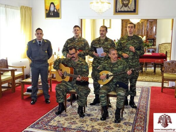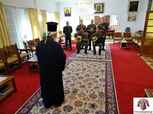 Ως είθισται, το Επισκοπείο επισκέφθηκε χορωδία του Κέντρου Εκπαιδεύσεως Εφοδιασμού Μεταφορών, για να ψάλλει τα Κάλαντα. Ο σεπτός Ποιμενάρχης μας ευχαρίστησε τον επικεφαλής υπαξιωματικό και τους στρατευμένους για την παρουσία τους και τους ευχήθηκε το νέο έτος να συνοδευτεί από υγεία, χαρά και κατά Θεόν προκοπή για τους ίδιους και τις οικογένειές τους. Ακολούθησε το καθιερωμένο κέρασμα.