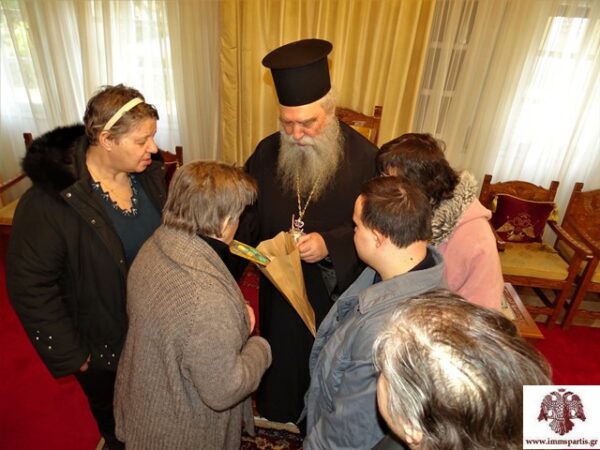 Στη συνέχεια τα κάλαντα έψαλαν στον Σεβ. Μητροπολίτη, σε συγκινησιακό και χαρμόσυνο κλίμα, τρόφιμοι του Ιδρύματος περιθάλψεως χρονίως πασχόντων ‘’ο Άγιος Παντελεήμων’’, τους οποίους συνόδευε ο Διευθυντής Πρωτ. Ιωάννης Προφύρης και εργαζόμενοι. Ο Σεβασμιώτατος ευχαρίστησε τροφίμους και εργαζομένους για την παρουσία και την αγάπη τους, τους ευχήθηκε για το νέο έτος, ενώ δέχθηκε ένα συμβολικό δώρο που είχαν φιλοτεχνήσει οι τρόφιμοι με την καθοδήγηση των εκπαιδευτικών τους.