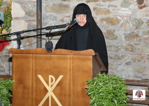 Στη συνέχεια χαιρετισμό απηύθυνε η Ηγουμένη της Ιεράς Μονής Αγίου Ιωάννου Θεολόγου Βερίνου Αιγίου, Μοναχή Επιστήμη Κιλλικίδου, η οποία μίλησε με περίσσια αγάπη για τον Γέροντα Ευσέβιο, του οποίου ο τάφος αποτελεί το σέμνωμα της Ιεράς Μονής, πηγή ευλογίας και παρακλήσεως τόσο για τα πνευματικά του τέκνα, όσο και για τους προσκυνητές που προσέρχονται εκεί να ζητήσουν τη μεσιτεία του.