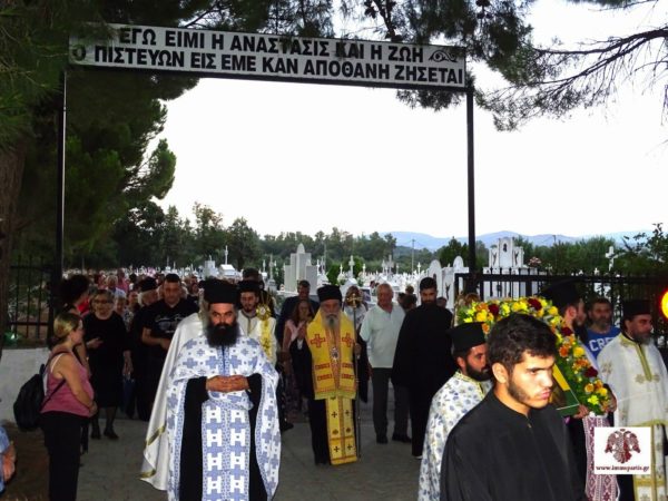 Εν συνεχεία, προπορευομένης της Φιλαρμονικής του Δ. Σπάρτης και των Ιερών λαβάρων, πραγματοποιήθηκε λιτάνευση της Ιεράς Εικόνας του Αγίου στο χώρο του Κοιμητηρίου, όπου ο σεπτός Ποιμενάρχης τέλεσε Τρισάγιο για όλους εκείνους που αναπαύονται εκεί από την έναρξη της λειτουργίας του μέχρι σήμερα.