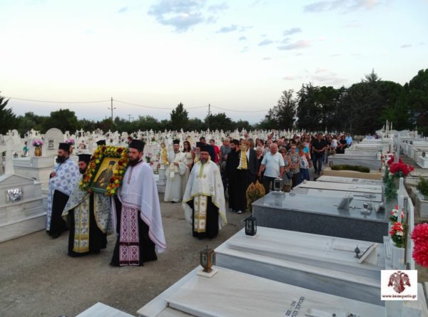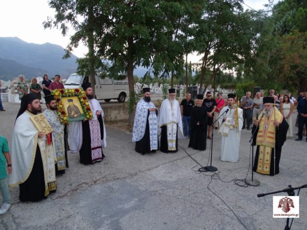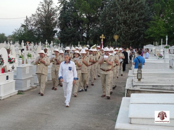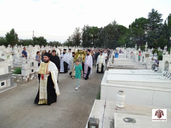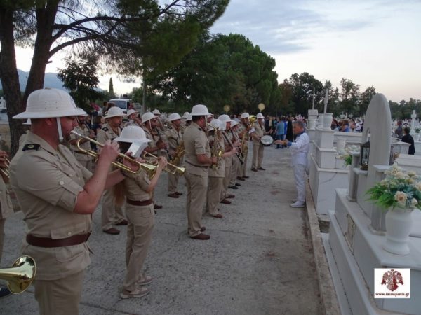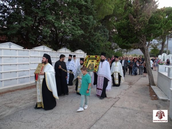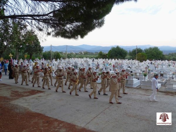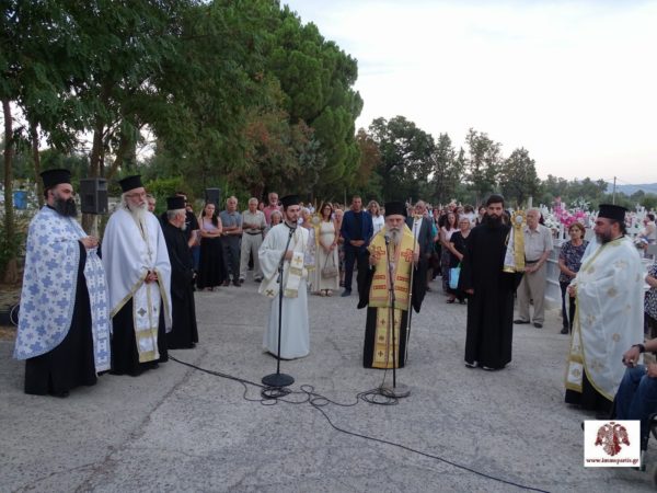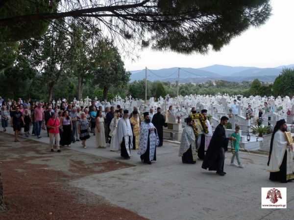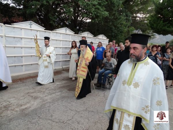 Εν συνεχεία, προπορευομένης της Φιλαρμονικής του Δ. Σπάρτης και των Ιερών λαβάρων, πραγματοποιήθηκε λιτάνευση της Ιεράς Εικόνας του Αγίου στο χώρο του Κοιμητηρίου, όπου ο σεπτός Ποιμενάρχης τέλεσε Τρισάγιο για όλους εκείνους που αναπαύονται εκεί από την έναρξη της λειτουργίας του μέχρι σήμερα.