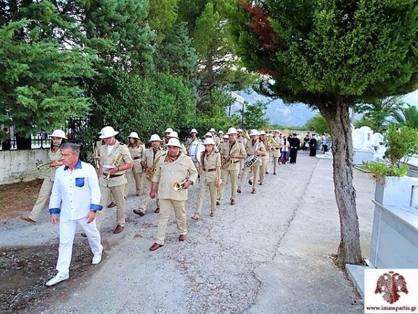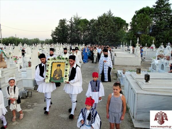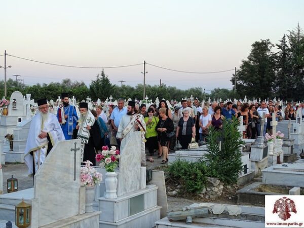 Εν συνεχεία, προπορευομένης της Φιλαρμονικής του Δ. Σπάρτης, των Ιερών λαβάρων και του Ιερού Ευαγγελίου, πραγματοποιήθηκε, συνοδεία πλήθους πιστών, η καθιερωμένη λιτάνευση της Ιερής Εικόνας του Αγίου στο χώρο του Κοιμητηρίου, όπου ο σεπτός Ποιμενάρχης μας τέλεσε επιμνημόσυνη δέηση για τους αναπαυόμενους εκεί από την έναρξη της λειτουργίας του μέχρι σήμερα.