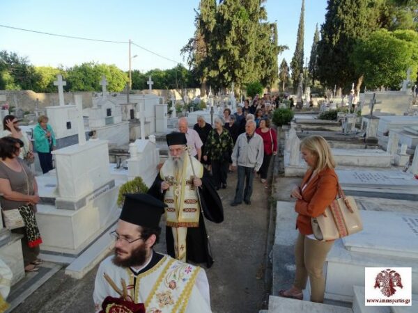 Αμέσως μετά, πραγματοποιήθηκε λιτάνευση της Ιερής Εικόνας της Πεντηκοστής στους χώρους του Κοιμητηρίου. Ακολούθησε επιμνημόσυνη δέηση προς ανάπαυση των ψυχών των κεκοιμημένων. Η φετινή τελετή ήταν σεμνή, χωρίς τη συμμετοχή πολλών κληρικών και της Φιλαρμονικής του Δ. Σπάρτης, στο πλαίσιο των μέτρων προστασίας για το νέο κορωνοϊό.