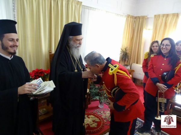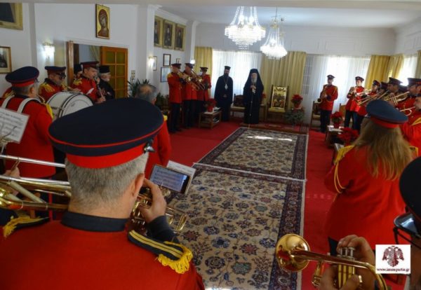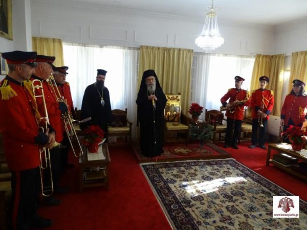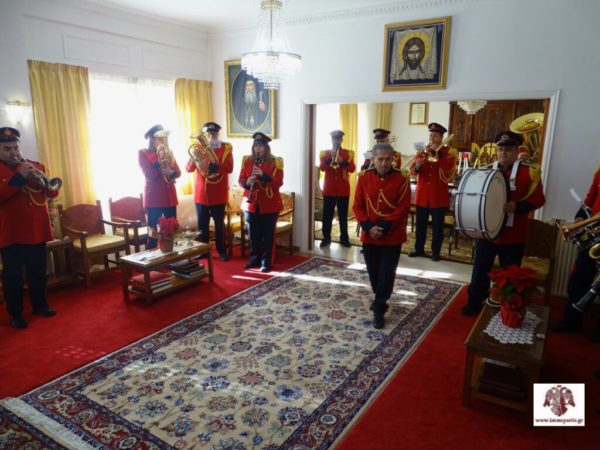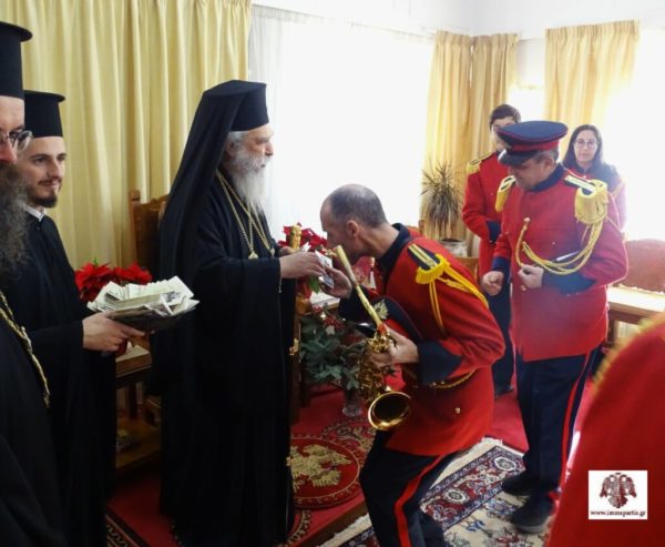 Ακολούθως, ο Σεβασμιώτατος δέχθηκε στο Επισκοπείο την Φιλαρμονική του Δήμου Σπάρτης για τα πρωτοχρονιάτικα κάλαντα. Ο Σεβ. Ποιμενάρχης συνεχάρη τον μαέστρο κ. Σαράντο Κανελλάκο και τα μέλη της Φιλαρμονικής για την άψογη, όπως πάντα, παρουσία τους και για την εν γένει προσφορά τους στον τόπο, ενώ ευχήθηκε το νέο έτος να είναι ευλογημένο.