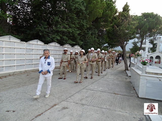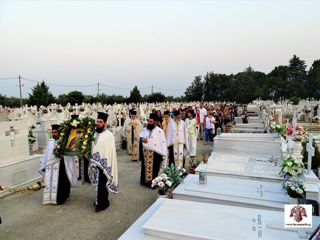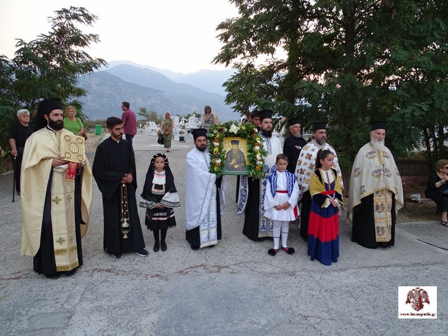 Εν συνεχεία, προπορευομένης της Φιλαρμονικής του Δ. Σπάρτης και των Ιερών λαβάρων, πραγματοποιήθηκε λιτάνευση της Ιεράς Εικόνας του Αγίου στο χώρο του Κοιμητηρίου, όπου ο σεπτός Ποιμενάρχης τέλεσε επιμνημόσυνη δέηση για όλους εκείνους που αναπαύονται εκεί από την έναρξη της λειτουργίας του μέχρι σήμερα.
