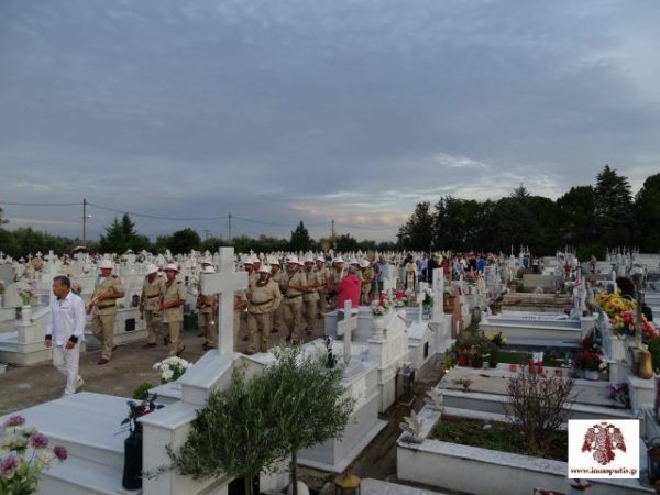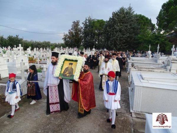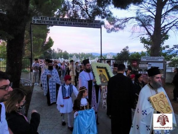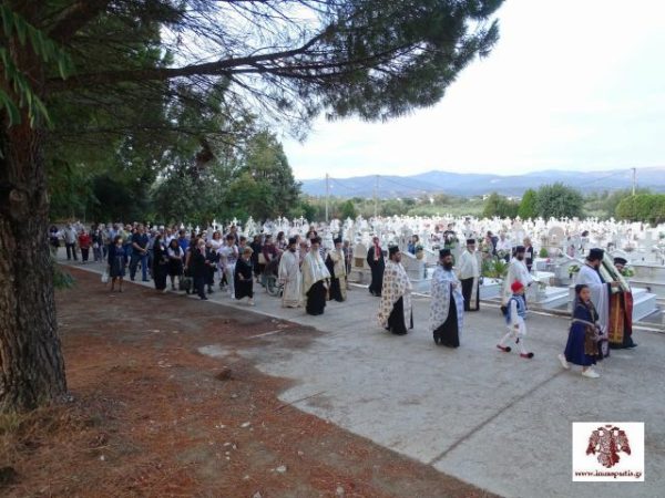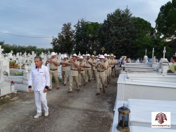 Εν συνεχεία, προπορευομένης της Φιλαρμονικής του Δ. Σπάρτης και συνοδεία πλήθους πιστών, πραγματοποιήθηκε η καθιερωμένη λιτάνευση της Ιεράς Εικόνας του Αγίου στο χώρο του Κοιμητηρίου, όπου ο Μητροπολίτης Μονεμβασίας και Σπάρτης κ. Ευσταθίος τέλεσε Επιμνημόσυνη Δέηση για τους αναπαυομένους εκεί από την έναρξη της λειτουργίας του μέχρι σήμερα.