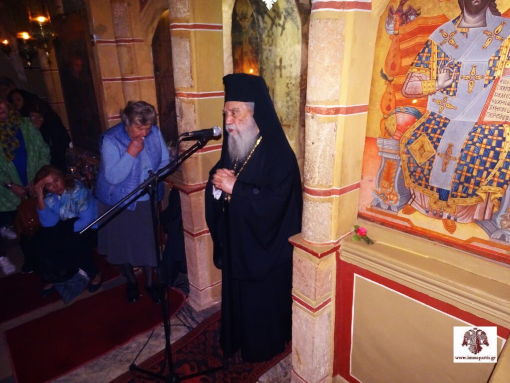 Κατά τη διάρκεια της εσπερινής λατρευτικής σύναξης, ο Σεβασμιώτατος καλωσόρισε τους πολυάριθμους ευλαβείς προσκυνητές στον ιστορικό Μυστρά, που είναι αγιασμένος με τα αίματα των μαρτύρων της Πίστεως και της Πατρίδας μας και είναι ποτισμένος με τα δάκρυα ή της μετανοίας ή της αγωνίας πατέρων και αδελφών μας που έζησαν εκεί. Ιδιαίτερα στον Ναό αυτό, υπογράμμισε ο Ποιμενάρχης, στέφθηκε Αυτοκράτορας του Βυζαντίου ο Κωνσταντίνος Παλαιολόγος, μαρτύρησε ο Άγιος Ανανίας και λειτούργησε ο Άγιος Γρηγόριος Επίσκοπος Δέρκων ο από Λακεδαιμονίας. Ακολούθως, ευχαρίστησε θερμά τον Σεβασμιώτατο Μητροπολίτη Προικοννήσου κ. Ιωσήφ για την αποδοχή της πρόσκλησής του και για την τιμητική του παρουσία. Παράλληλα, επισήμανε ότι αποτελεί διδάσκαλο για την βαθιά του πίστη, το θεάρεστο έργο και το φλογερό κήρυγμά του, αλλά και για τη θαυμαστή διακονία του στην Βασιλίδα των Πόλεων. Ολοκληρώνοντας, ευχήθηκε σε όλους τους πιστούς να βρίσκονται πάντα υπό την σκέπη της Παναγίας μας, η οποία σαν Θεομάνα και Μάνα όλων μας και θέλει και μπορεί να μας βοηθήσει.