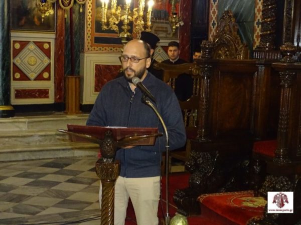 Στη συνέχεια, για τα πνευματικά μηνύματα των Αγίων Ημερών της Μεγάλης Εβδομάδας, μίλησε ο Αρχιερατικός Επίτροπος Σπάρτης και εφημέριος του Ι.Ν. Αγίου Σπυρίδωνος, Πανοσιολογιώτατος Αρχιμανδρίτης π. Σεραφείμ Κοσμάς, ο οποίος επιπροσθέτως – κατά τη διάρκεια της εκδήλωσης – προλόγιζε καταλλήλως κάθε ύμνο. Σε μέρος του προγράμματος συμμετείχε και η νεοσύστατη παιδική χορωδία της Σχολής, με υπεύθυνο τον κ. Ευάγγελο Θεοδώρου, η οποία χειροκροτήθηκε θερμά.