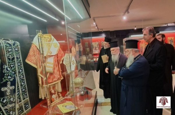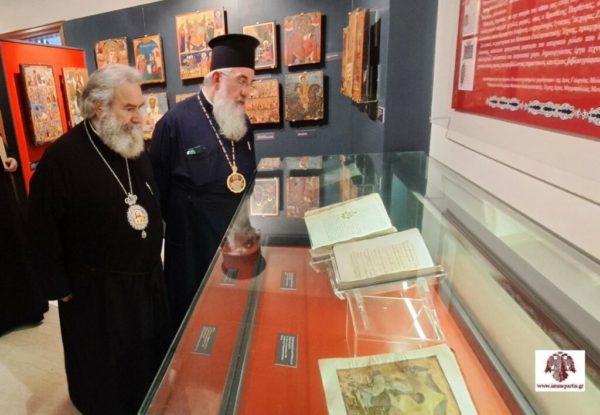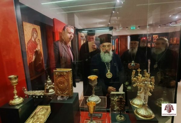 Μετά την πανήγυρη και πριν την παράθεση επίσημου γεύματος, ο Σεβασμιώτατος Αρχιεπίσκοπος Κρήτης κ. Ευγένιος Β΄ και ο Σεβασμιώτατος Μητροπολίτης Μάνης κ. Χρυσόστομος, συνοδευόμενοι από τον Σεβασμιώτατο Μητροπολίτη κ. Ευστάθιο και τον Θεοφιλέστατο Επίσκοπο Λακεδαιμονίας κ. Θεόφιλο, επισκέφθηκαν το Μουσείο Εκκλησιαστικής Τέχνης της Ιεράς Μητρόπολης Σπάρτης, όπου ξεναγήθηκαν από τον Επιμελητή του, κ. Δημήτριο Μπαγιώκο, εκφράζοντας τον θαυμασμό τους για τα κειμήλια που φιλοξενούνται στον καλαίσθητο αυτό χώρο.