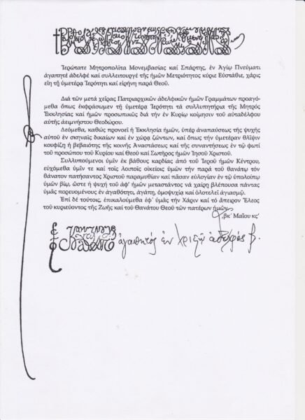 Συλλυπητήρια επιστολή απέστειλε ο Παναγιώτατος Οικουμενικός Πατριάρχης κ.κ. Βαρθολομαίος στον Σεβασμιώτατο Μητροπολίτη Μονεμβασίας και Σπάρτης κ. Ευστάθιο, για την πρόσφατη εκδημία του αδελφού του, Θεοδώρου Σπηλιώτη. Ακολουθεί το κείμενο της επιστολής: