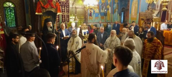 Στην Μυρτέα, στον Ενοριακό Ιερό Ναό Αγίου Γεωργίου, τελέσθηκε το απόγευμα της παραμονής ο πανηγυρικός Αρχιερατικός Εσπερινός μετ’ αρτοκλασίας χοροστατούντος του Σεβασμιωτάτου Μητροπολίτη Μονεμβασίας και Σπάρτης κ. Ευσταθίου και με τη συμμετοχή αρκετών κληρικών της τοπικής Εκκλησίας. Συμπροσευχούμενος παρέστη και ο Θεοφιλέστατος Επίσκοπος Λακεδαιμονίας κ. Θεόφιλος.