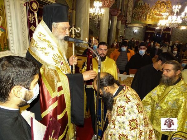 Εν συνεχεία ο Σεβ. Ποιμενάρχης απένειμε το οφφίκιο του Οικονόμου στον εφημέριο του Ι.Ν Οσίου Νίκωνος π. Κωνσταντίνο Σκάλτσα, μιλώντας με επαινετικά λόγια για τη μόρφωσή του, αφού είναι θεολόγος, το εκκλησιαστικό ήθος του, την αφοσίωση στη διακονία του και την πολυμελή χριστιανική οικογένεια που έχει δημιουργήσει. Παράλληλα υπογράμμισε ότι το επιγονάτιο που λαμβάνει ο Οικονόμος συμβολίζει την πετσέτα με την οποία ο Χριστός σκούπισε τα πόδια των μαθητών Του κατά το Μυστικό Δείπνο και υπενθυμίζει στους κληρικούς την ανάγκη για ταπεινοφροσύνη.