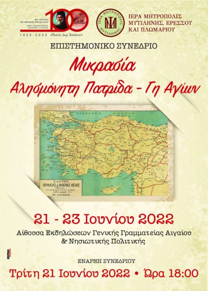 Η Ιερά Μητρόπολη Μυτιλήνης, Ερεσσού και Πλωμαρίου, στο πλαίσιο σειράς εκδηλώσεων τιμής και μνήμης στην 100ετηρίδα της Μικρασιατικής Καταστροφής που έχει προγραμματίσει, διοργανώνει Επιστημονικό Συνέδριο, με θέμα: «Μικρασία: Αλησμόνητη Πατρίδα – Γη Αγίων».