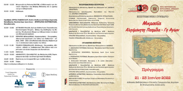 Η Ιερά Μητρόπολη Μυτιλήνης, Ερεσσού και Πλωμαρίου, στο πλαίσιο σειράς εκδηλώσεων τιμής και μνήμης στην 100ετηρίδα της Μικρασιατικής Καταστροφής που έχει προγραμματίσει, διοργανώνει Επιστημονικό Συνέδριο, με θέμα: «Μικρασία: Αλησμόνητη Πατρίδα – Γη Αγίων».
